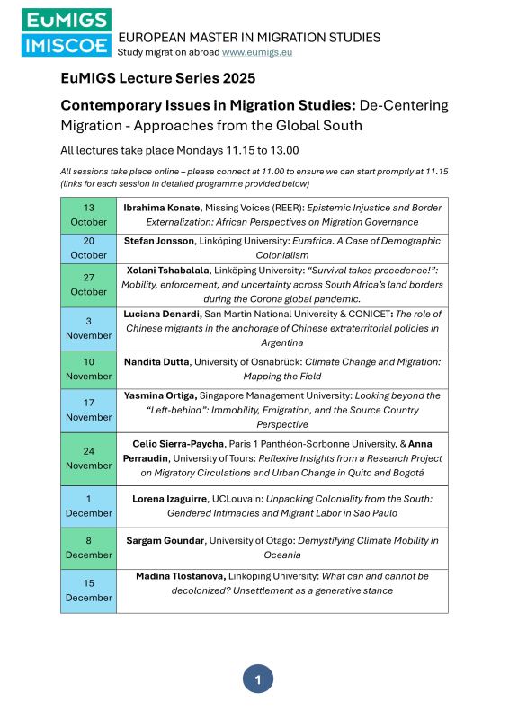 EuMIGS organizes an online Lecture Series on the topic of De-Centering Migration: Approaches from the Global South. The lectures are open to everyone but are primarily intended for master students.